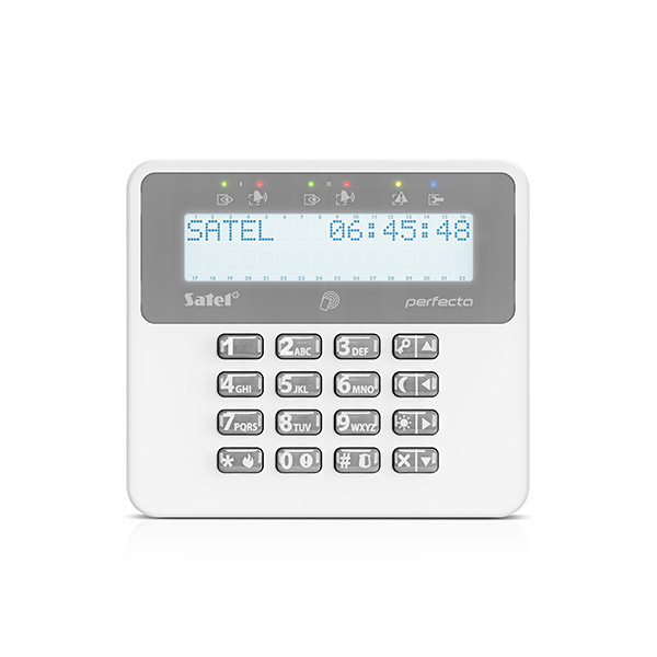 PRF-LCD-A2 is a wireless keypad designed for daily operation of the PERFECTA 64 M control panels operating together with one of the ABAX 2 system controllers: ACU-220 or ACU-280. Two-way encrypted radio communication with the controller takes place at 868 MHz frequency band. Large keys, an LCD display and LEDs indicating system status make operating the system convenient and clear. Apart from the number keys, the keypad also features keys for quick activation of the selected arming mode (day, night, full) and triggering three alarms: Panic, Fire, Aux.